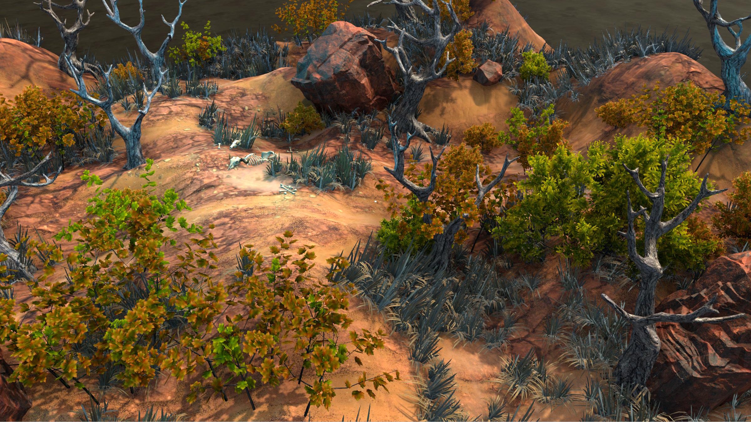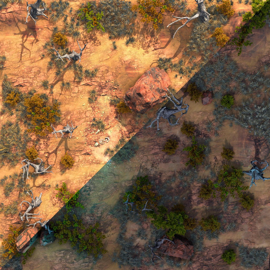 Badlands Prey – this arid stretch of badlands sets the stage for tense ambushes or survival encounters. Jagged boulders and scattered dead trees provide natural cover, forcing players to think carefully about line of sight and movement. The animal bones at the center hint at predators nearby—perfect for springing a hidden den of creatures or suggesting that raiders lie in wait. Whether used for a wasteland skirmish, a chase through rough terrain, or a desperate last stand, this map is built to keep players on edge.