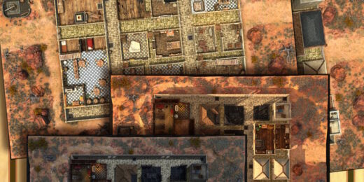Walled Village – A fortified desert settlement with living quarters, shops, and cannons!; use as a safe haven or center of conflict. VTT ready images for your next game!