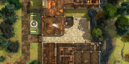 A detailed, two-story inn built into a hillside, complete with day/night maps, fully furnished interiors, and seven immersive 3D scene views. Includes VTT maps and access to the Dungeon Alchemist file so you can explore or customize the Inn for your own campaign! Prancing ponies optional.
