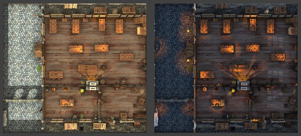 - 10 total battle maps covering The Flying Frog Tavern, The Flickering Flame, and The King’s Inn